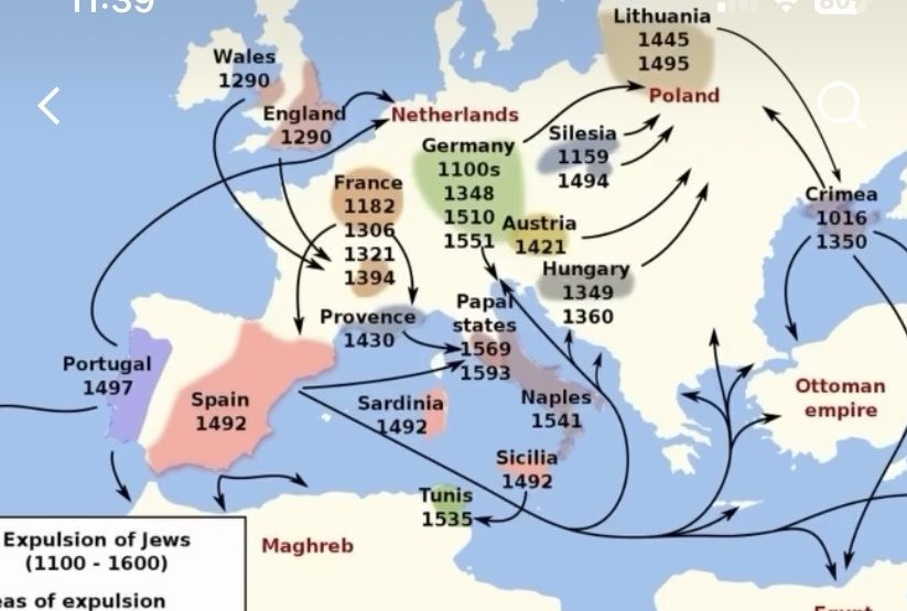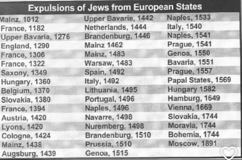 Jews have been expelled from 109 countries over the years. Here is a map and chart with some data: